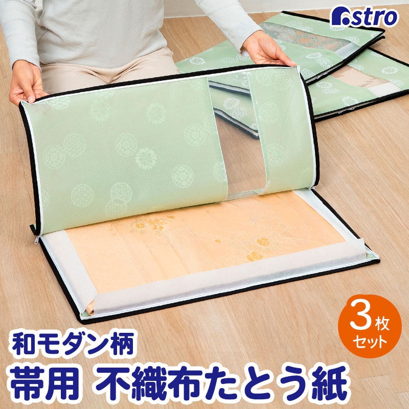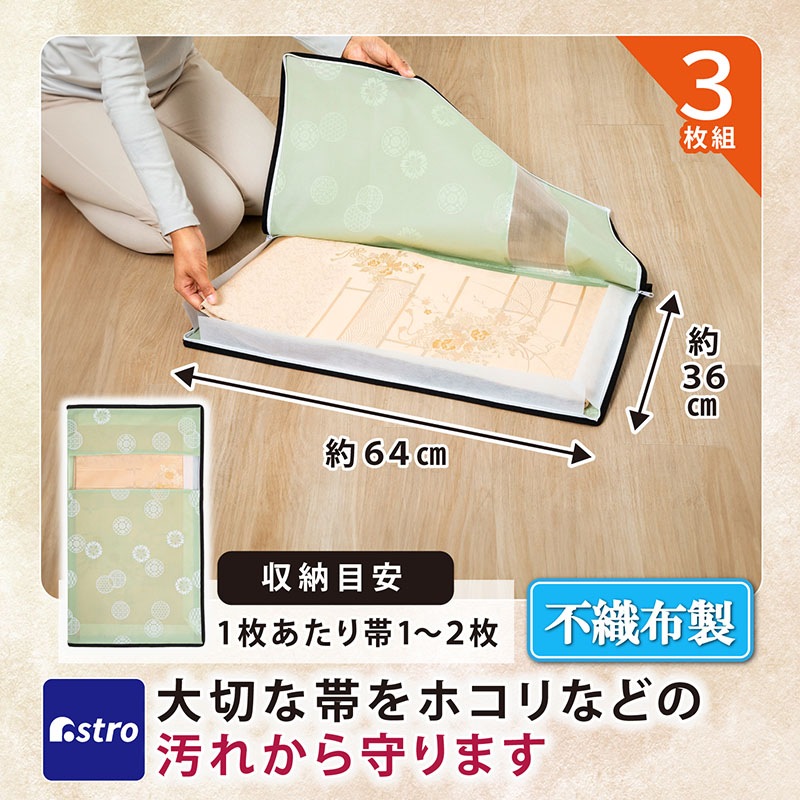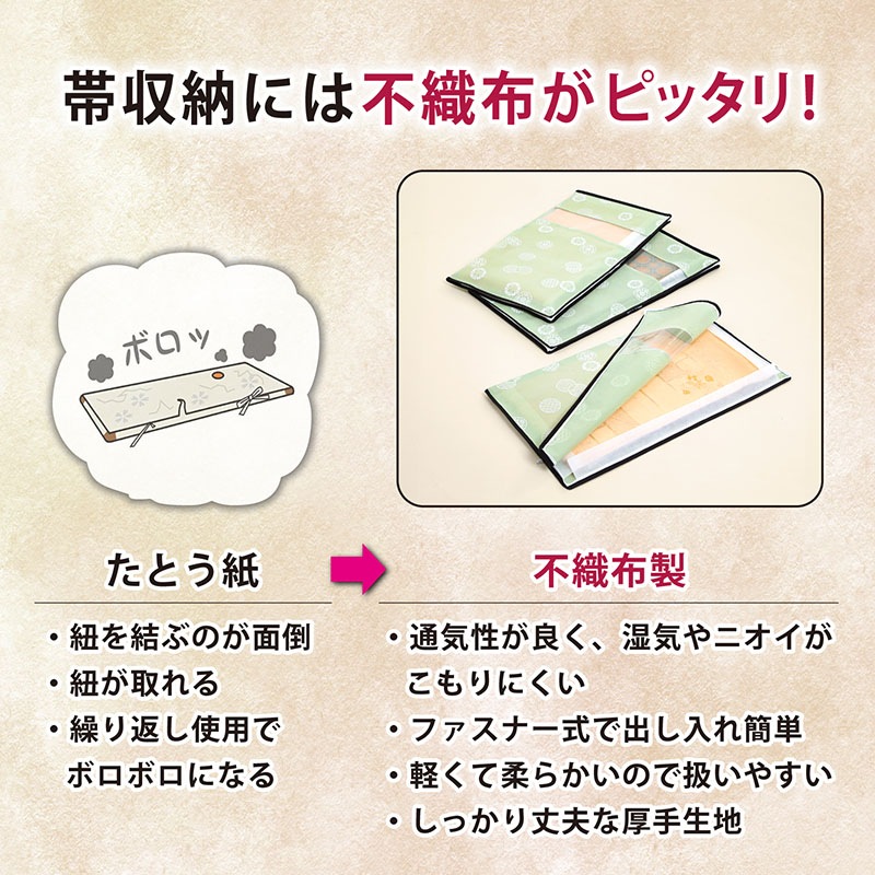 ●通気性が良く湿気やにおいのこもりにくい不織布製の帯収納袋。大切な着物の帯をホコリから守り保管。