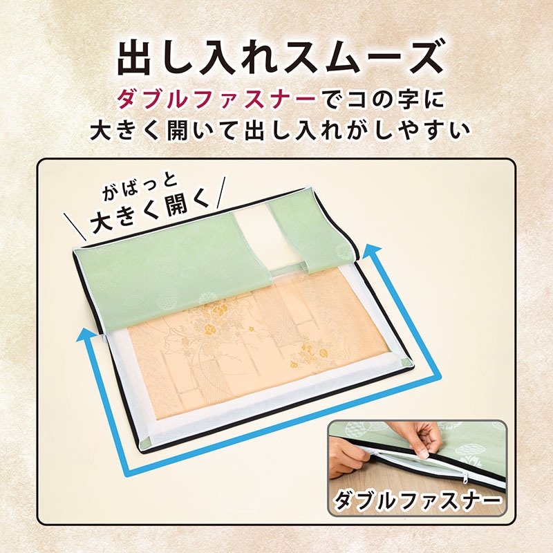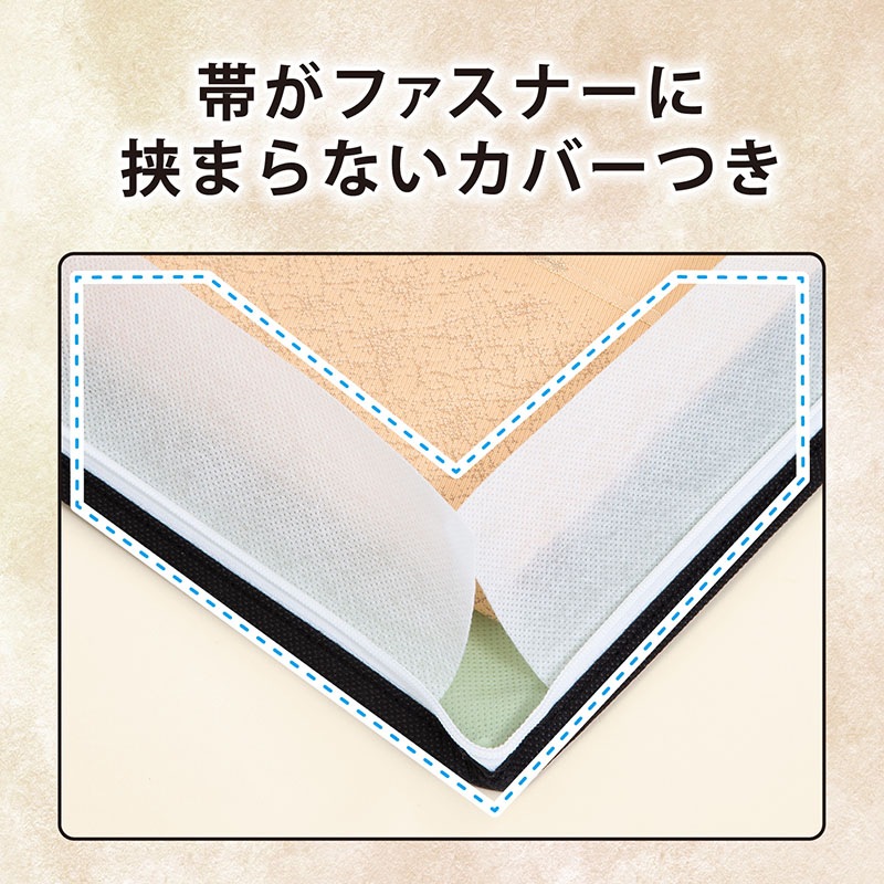 ●ダブルジップファスナーで3辺が開くので帯の出し入れがスムーズ。ファスナーによる挟み込みを防ぐ布付き。