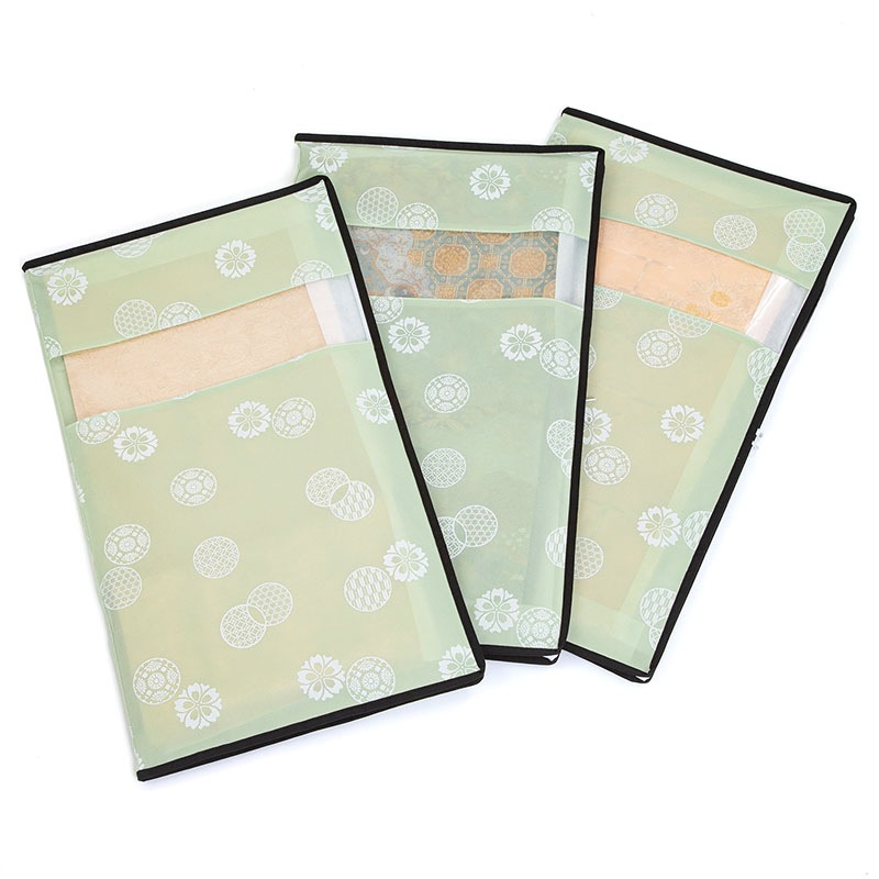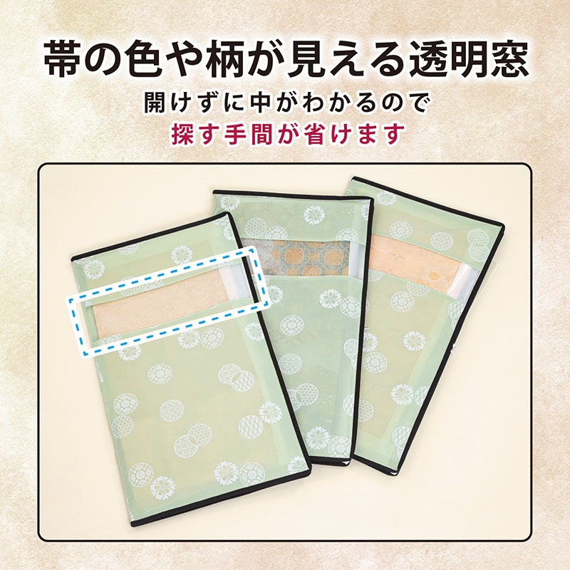 ●透明窓付きで入れたまま帯の色や柄の確認ができ管理しやすい。淡いグリーンの生地にオリジナルのモダンな和柄をプリント。