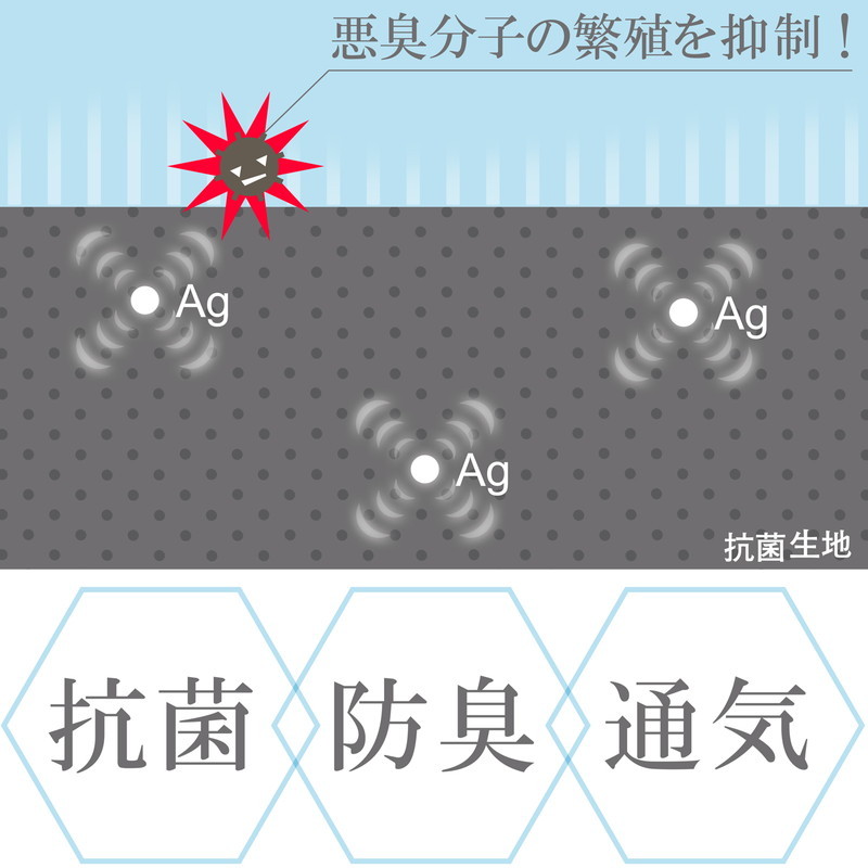 ●抗菌剤を生地に練り込み悪臭分子の増殖を抑制します。悪臭の元の菌の増殖を抑制します。