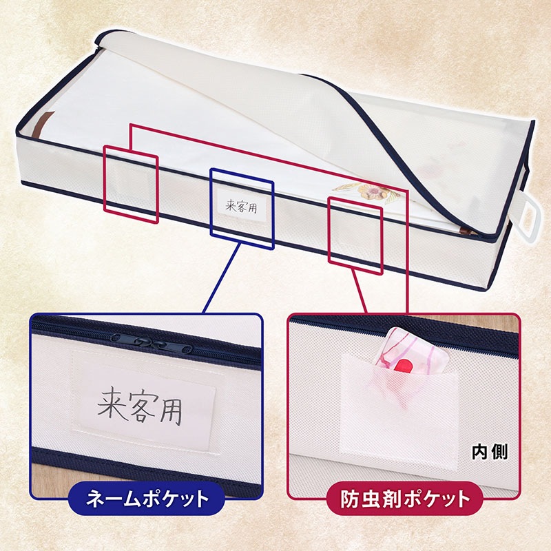 ●ネームホルダー付きでケースを開けずに中身が分かり管理しやすい。内側2か所に防虫剤入れポケット付き。