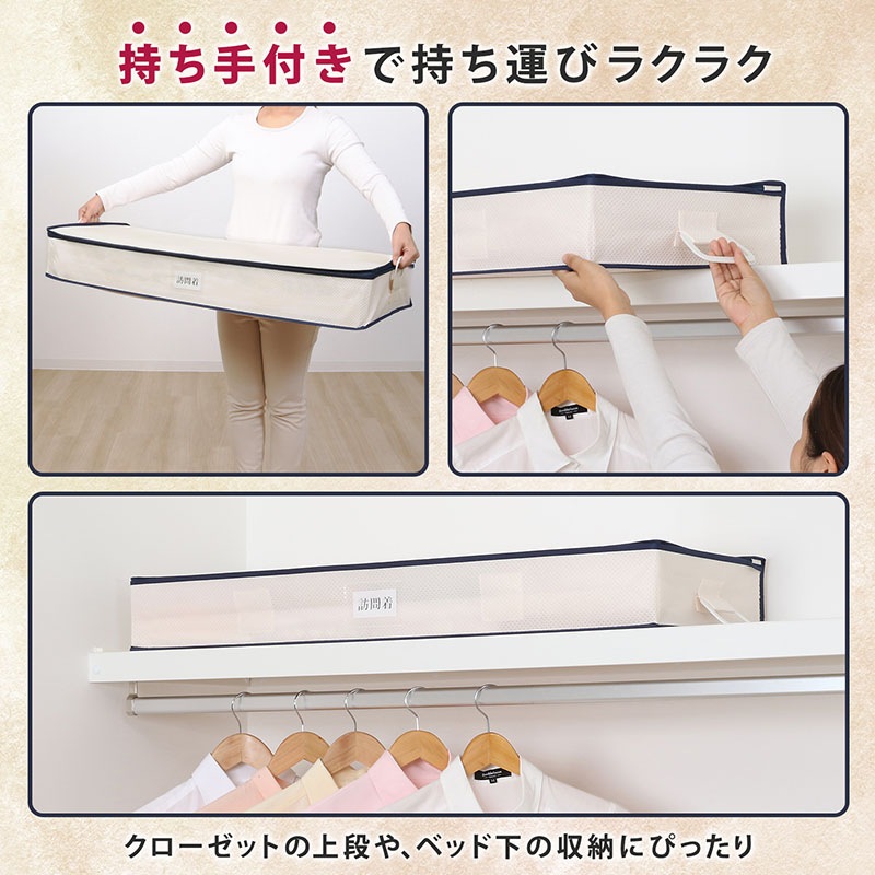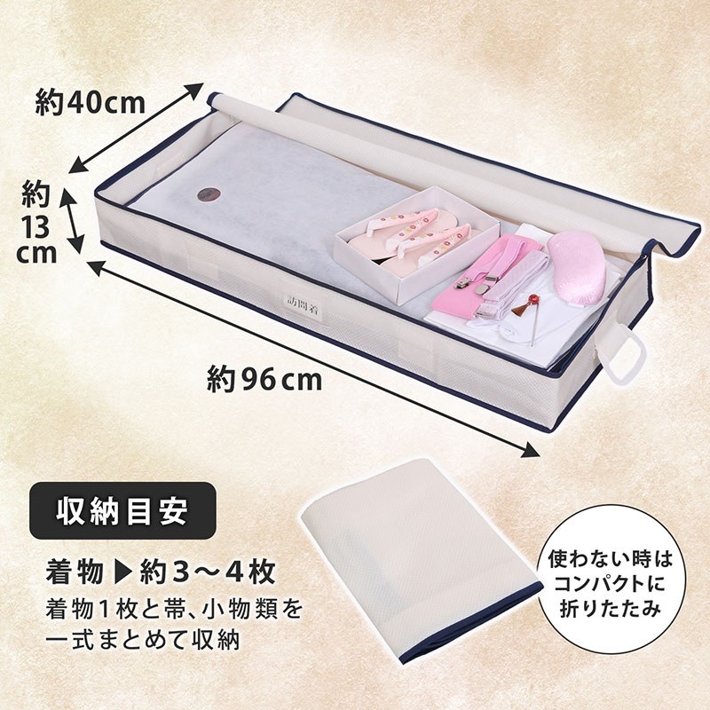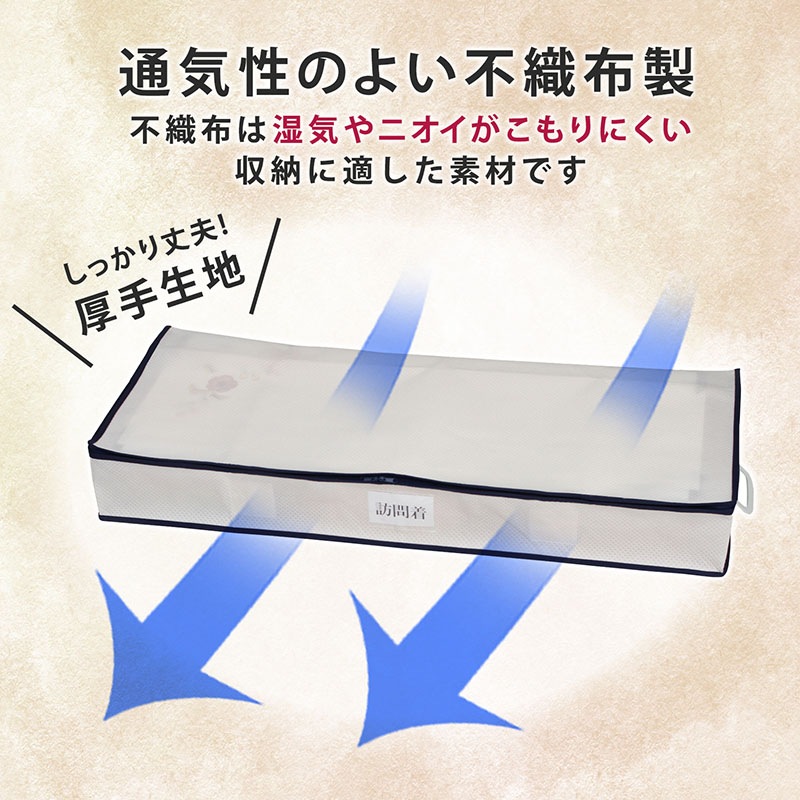 ●通気性が良く湿気やにおいのこもりにくい不織布製の着物収納ケース。大切な着物や浴衣の保管に。