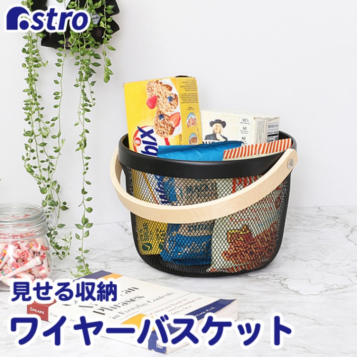 訳あり ワイヤーバスケット丸 木製持ち手 ブラック 711-94
