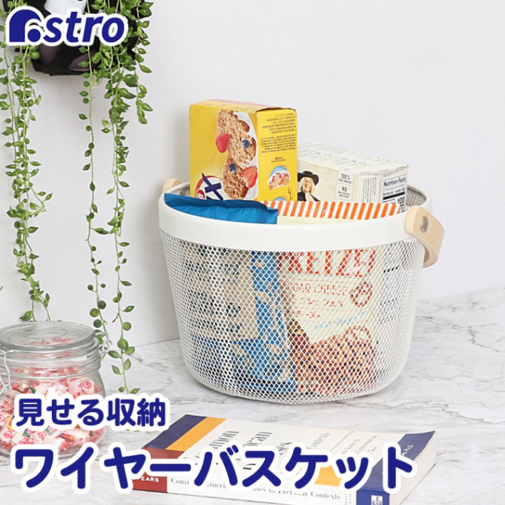 訳あり ワイヤーバスケット丸 木製持ち手 ホワイト 711-95