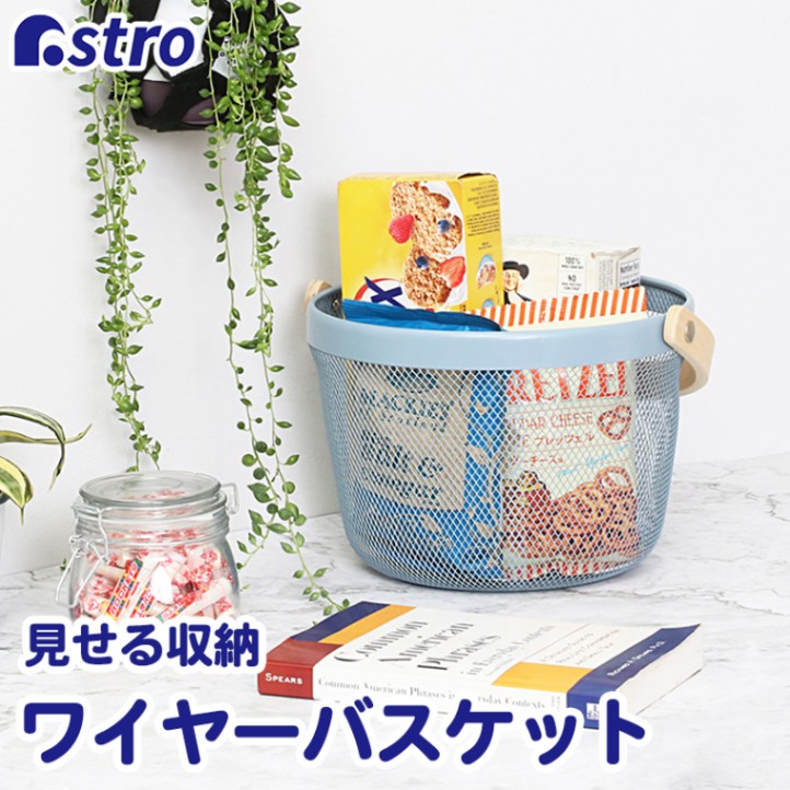 訳あり ワイヤーバスケット丸 木製持ち手 ブルーグレー 711-96