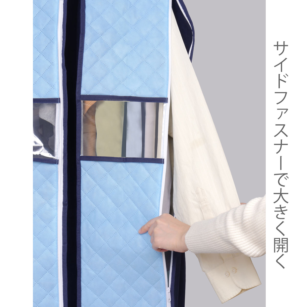 ●マチがあるのでクローゼット内の衣類をまとめてスッキリ収納。下部も縫製でホコリの侵入を防止。