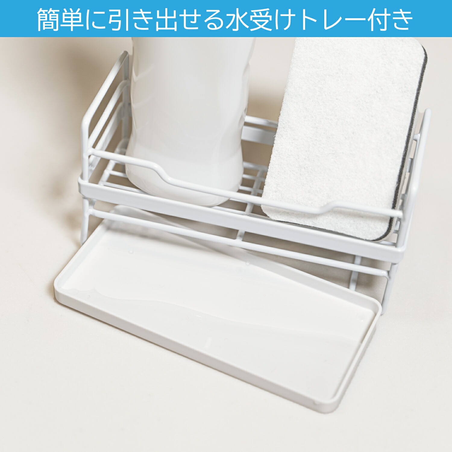 ●簡単に引き出せる水受けトレー付きのさまざまな場所で使えるスポンジラック。