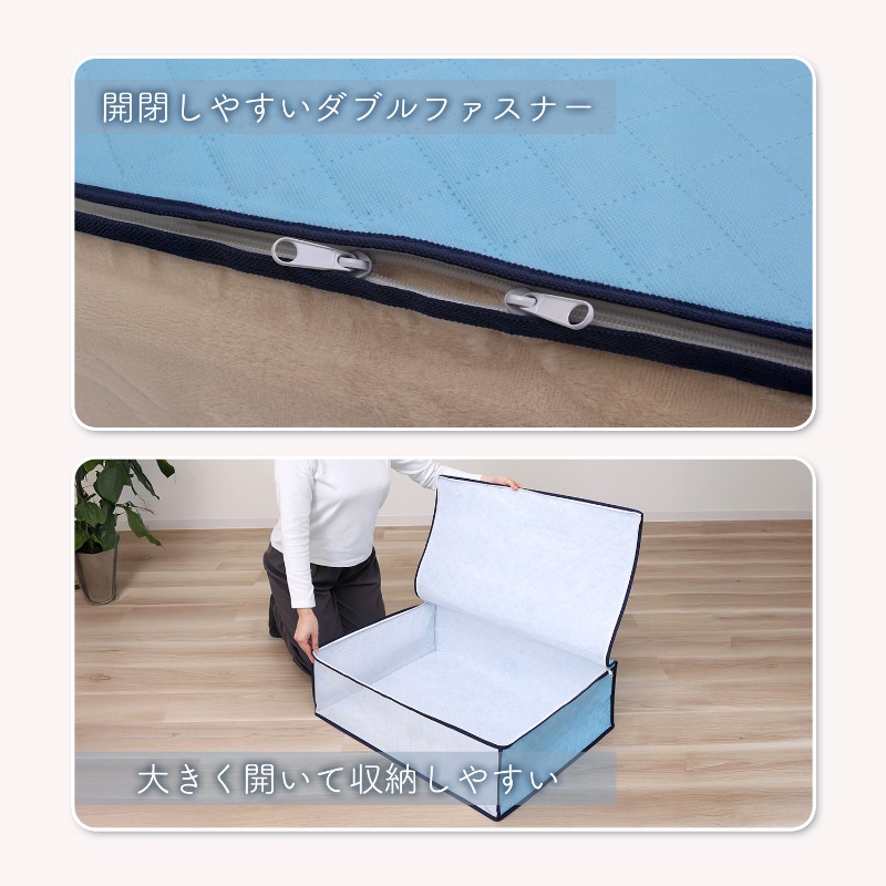 ●大きく開くファスナーで、たたんだ毛布を手軽に収納できる。タオルや洋服等の収納にも。