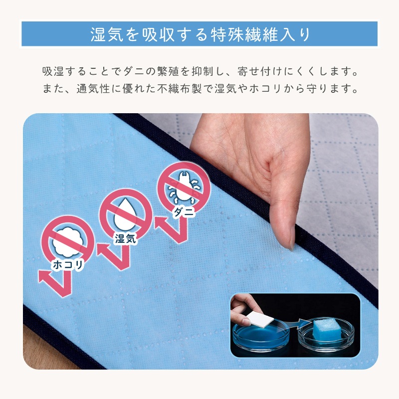 ●湿気を吸収する特殊繊維入り。吸湿することでダニの繁殖を抑制し、ダニを寄せ付けない。