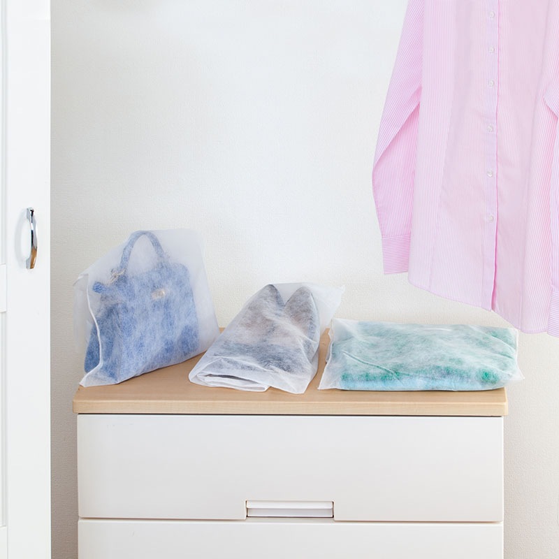 ●通気性の良い不織布の袋で靴・バッグ・衣類などを湿気やホコリから守りサッと保管。