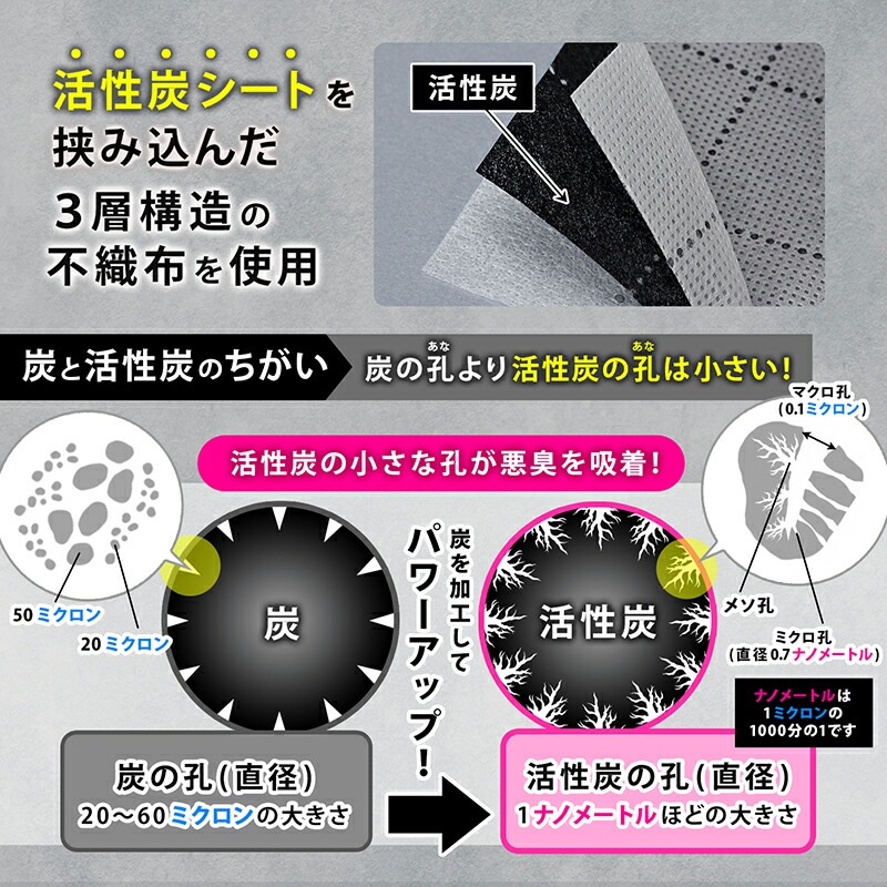 ●炭をさらに加工し多孔質にしたものが活性炭。空気中のにおいの元となる物質を吸着し消臭。※薬剤は使用しておりません。