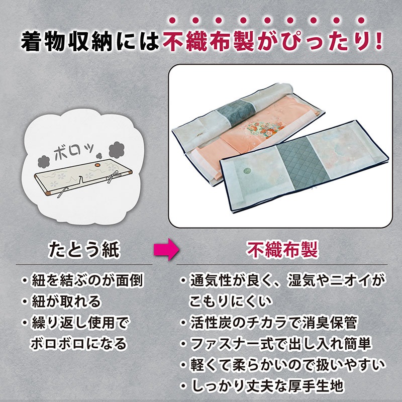 ●湿気やにおいがこもりにくい通気性の良い不織布製。大切な着物を消臭しながらホコリから守り保管できる。