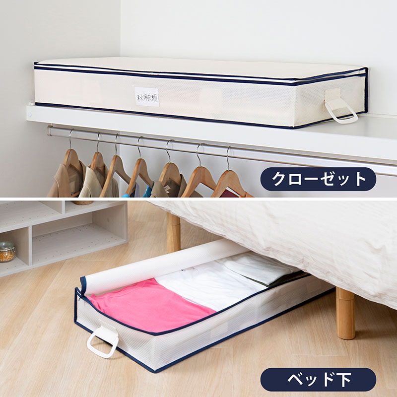 ●両サイドに持ち手付きでベッド下からの出し入れや持ち運びがしやすい。クローゼットの上部の棚や押し入れの隙間などにも。