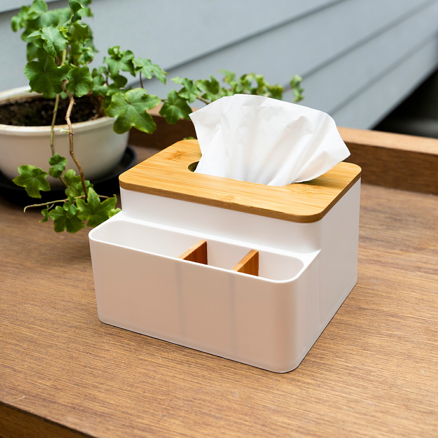 ●テーブルの上をスッキリまとめられる小物入れ付きのティッシュボックス。