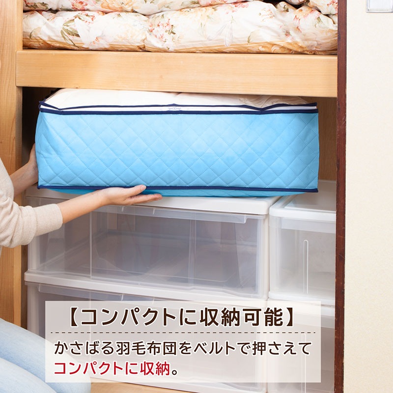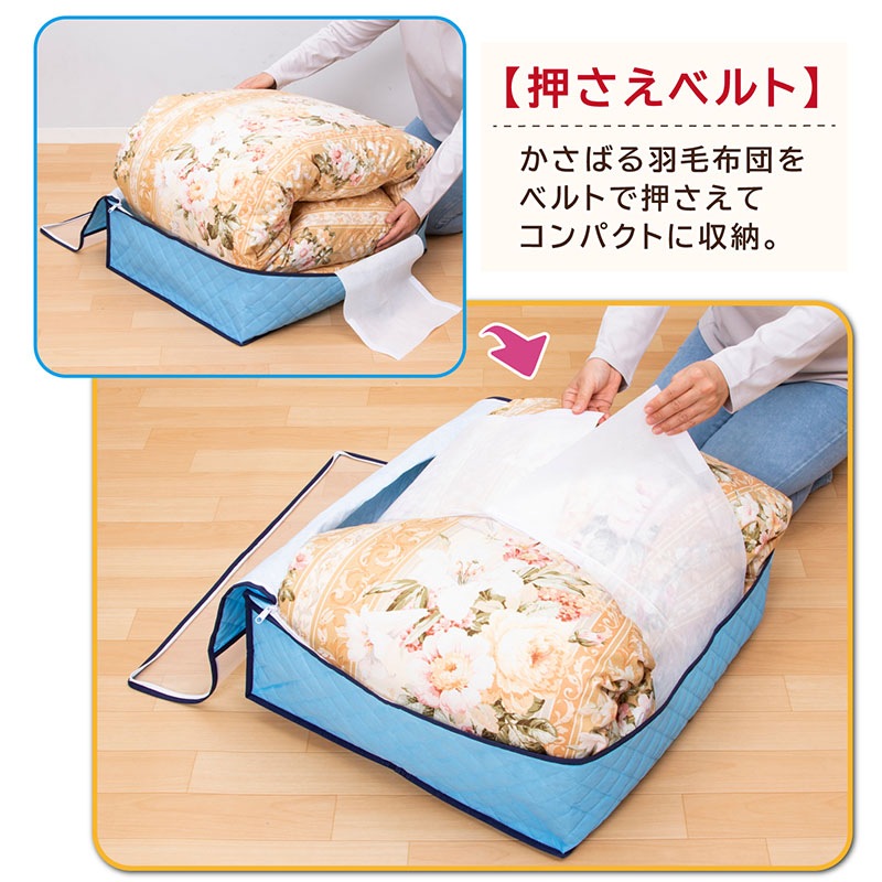 ●かさばる羽毛布団をベルトで押さえてコンパクトに収納。