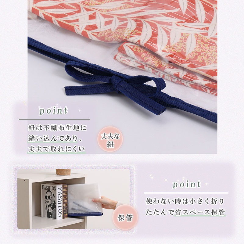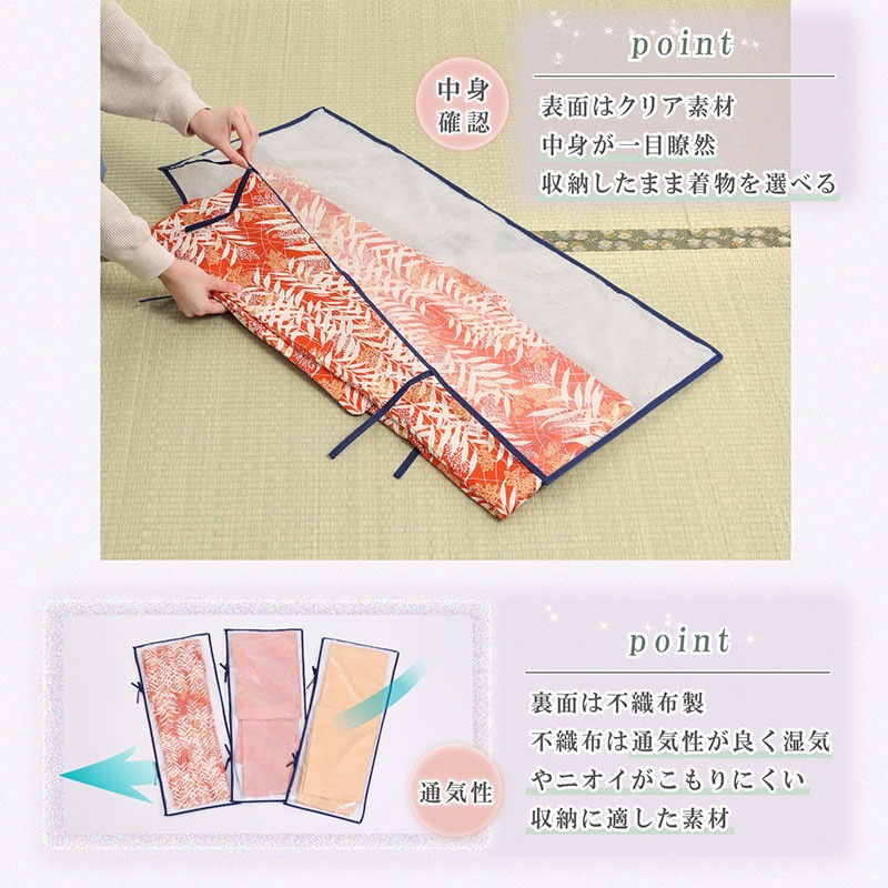 ●表面は前面透明素材だから着物がよく見える。袋ごと並べてディスプレイにも。