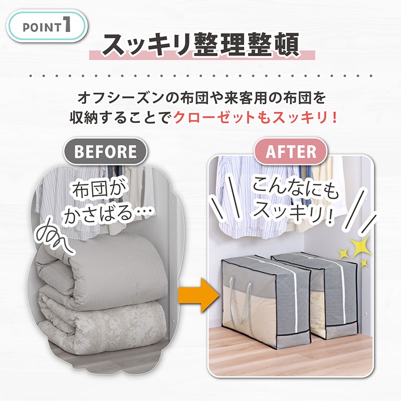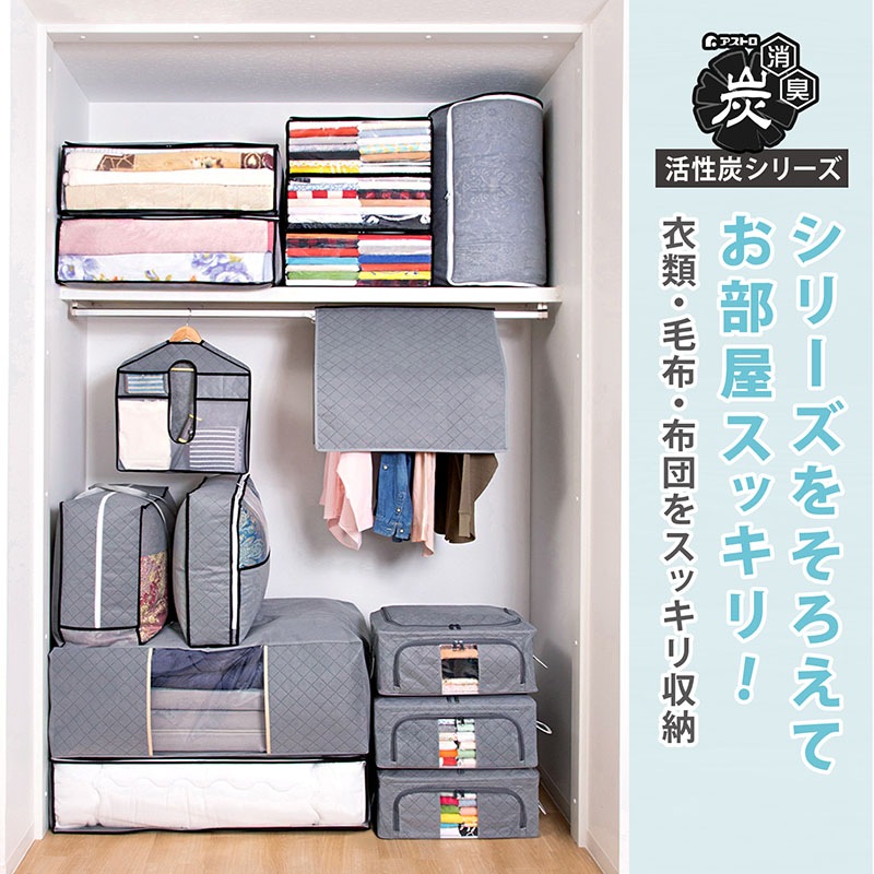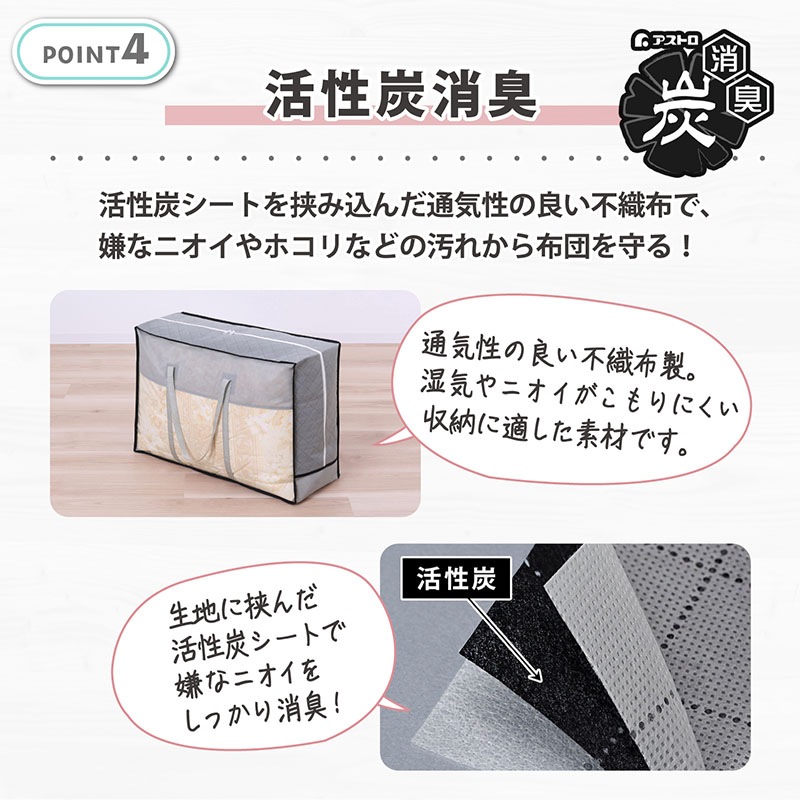 ●活性炭のチカラで消臭保管。活性炭シートがにおいを除去。かさばる羽毛布団をホコリ・汚れから守る。