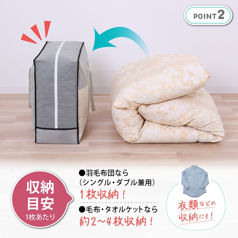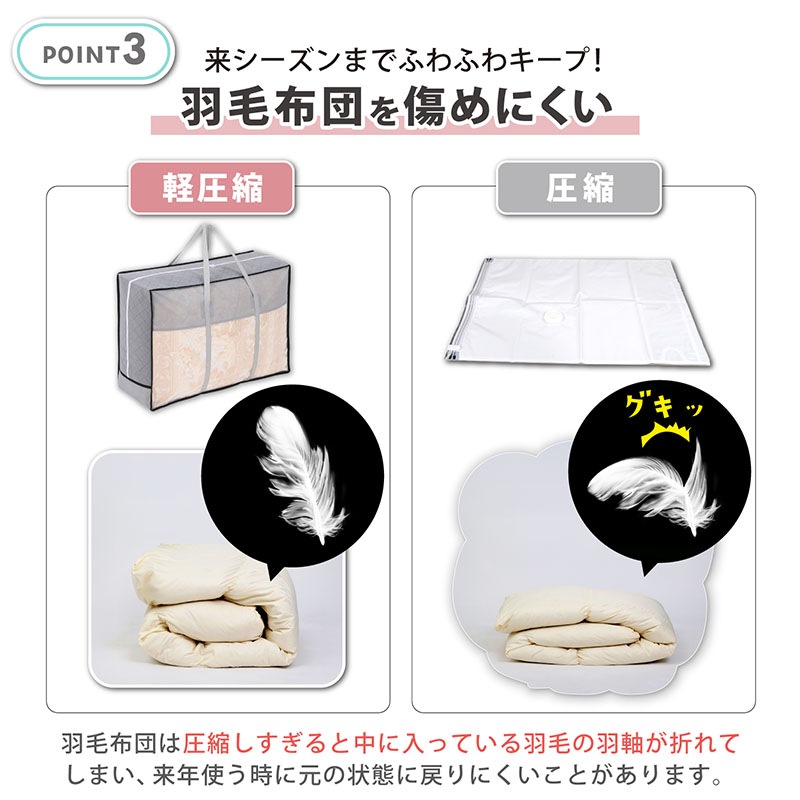 収納目安(1枚あたり):シングルサイズもしくはダブルサイズの羽毛布団1枚