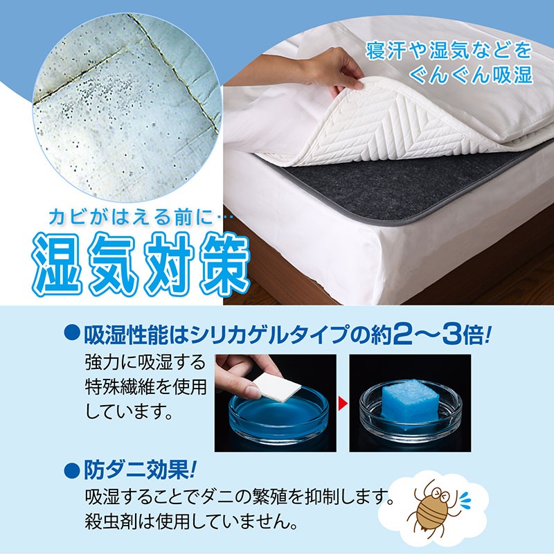 ●シリカゲルの約2~3倍の吸湿性がある繊維と活性炭を使用。吸湿することでダニの繁殖を抑制。