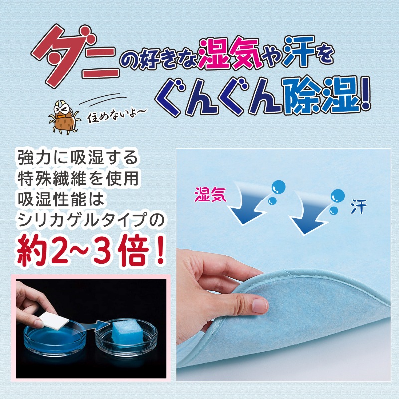 ●シリカゲルの約2~3倍の吸湿力がある特殊繊維を使用。吸湿することでダニの発生を抑制。