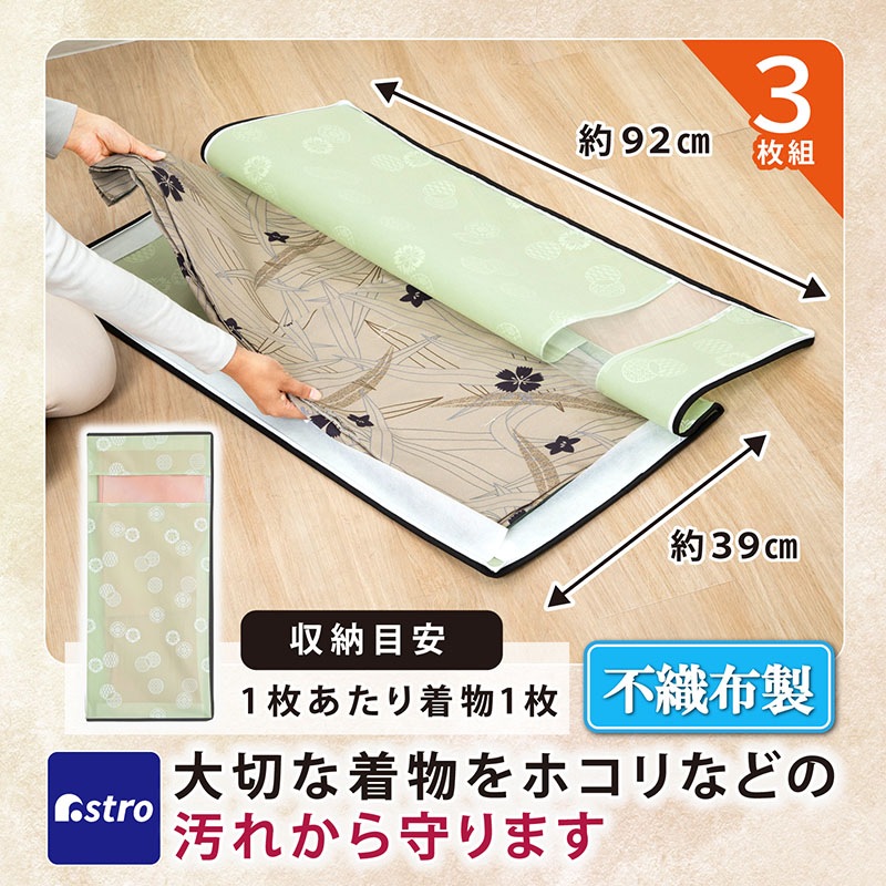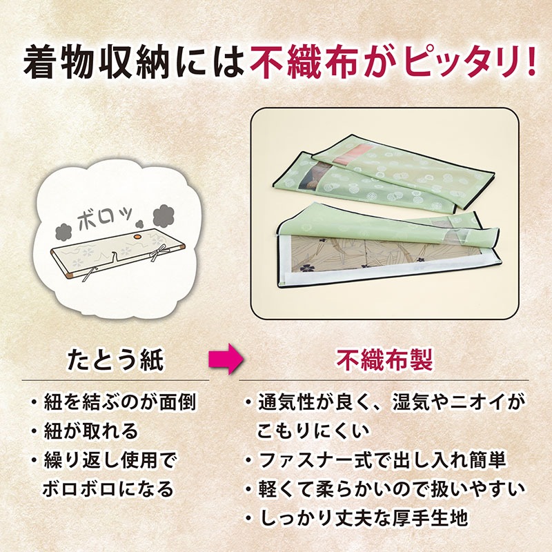 ●通気性が良く湿気やにおいのこもりにくい不織布製の着物収納袋。大切な着物をホコリから守り保管。