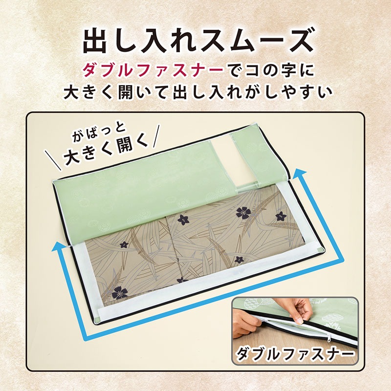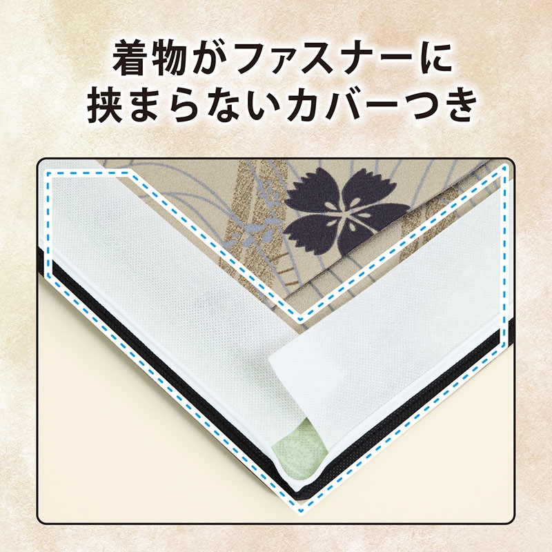 ●ダブルジップファスナーで3辺が開くので着物の出し入れがスムーズ。ファスナーによる挟み込みを防ぐ布付き。