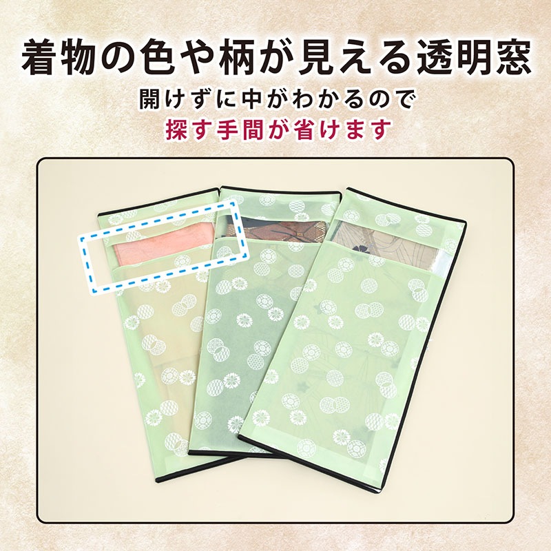 ●透明窓付きで収納したまま中身の確認ができる。淡いグリーンの生地にオリジナルのモダンな和柄をプリント。