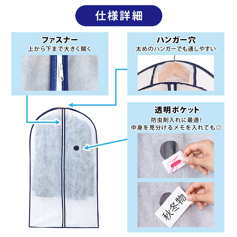 ●中身の見える透明窓と防虫剤用ポケット付き。透明の防虫剤用ポケットなので取り替えサインが一目で分かる。ネームホルダーとして中の衣類のメモを入れてもOK。