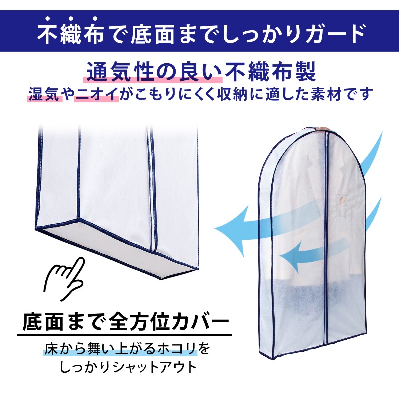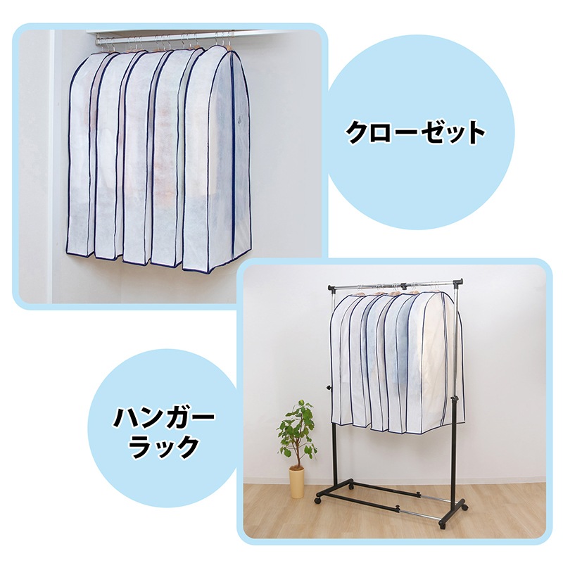 ●シワをつけたくない大切な衣類を吊り下げたままホコリや汚れから守る衣類カバー。幅広マチ付きで厚手の衣類や複数枚の洋服をまとめて収納可能。