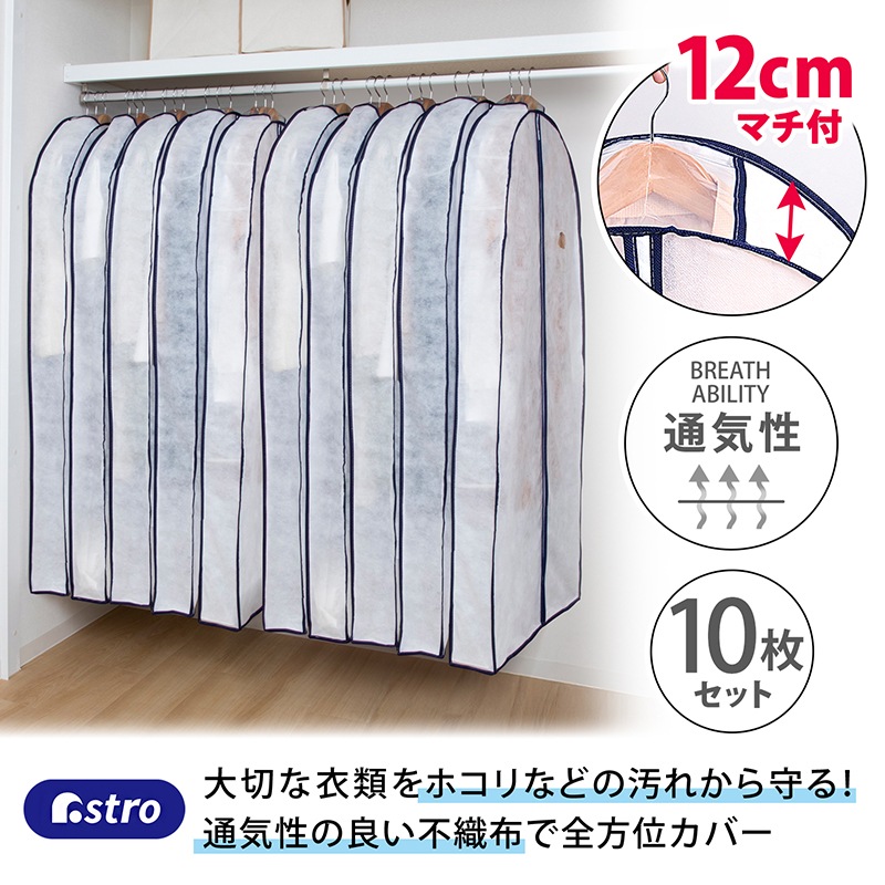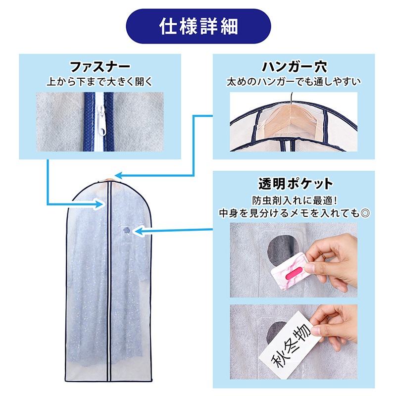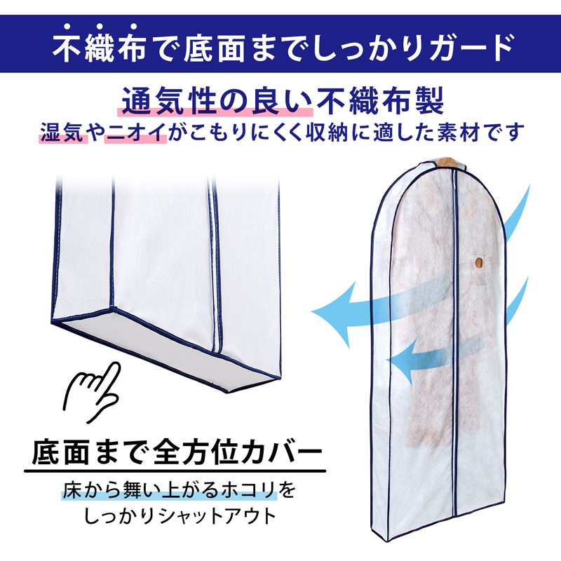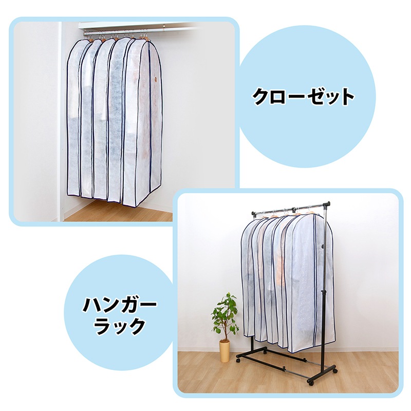 ●シワをつけたくない大切な衣類を吊り下げたままホコリや汚れから守る衣類カバー。幅広マチ付きで厚手の衣類や複数枚の洋服をまとめて収納可能。
