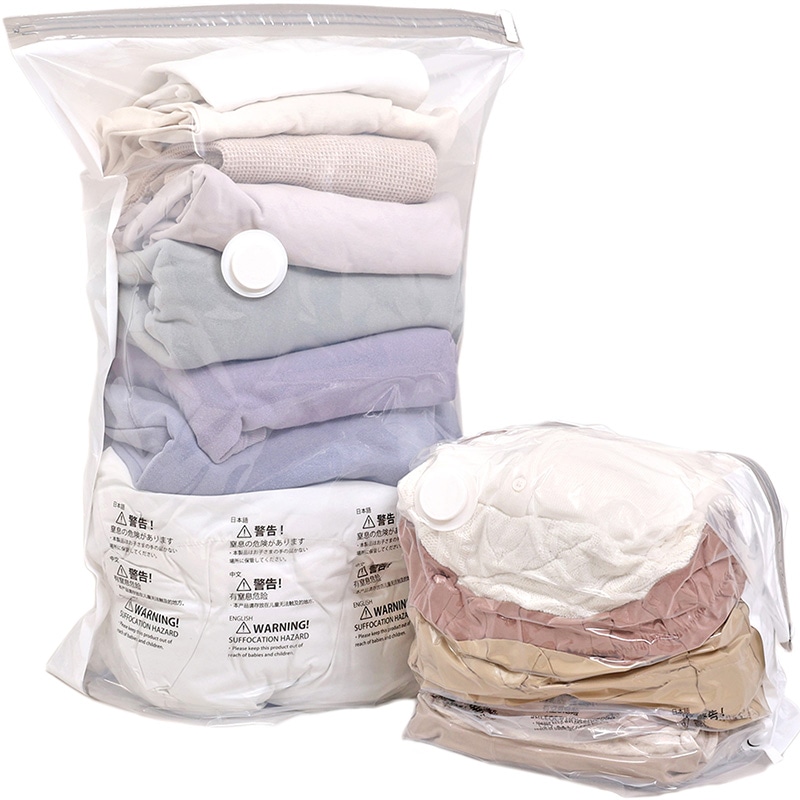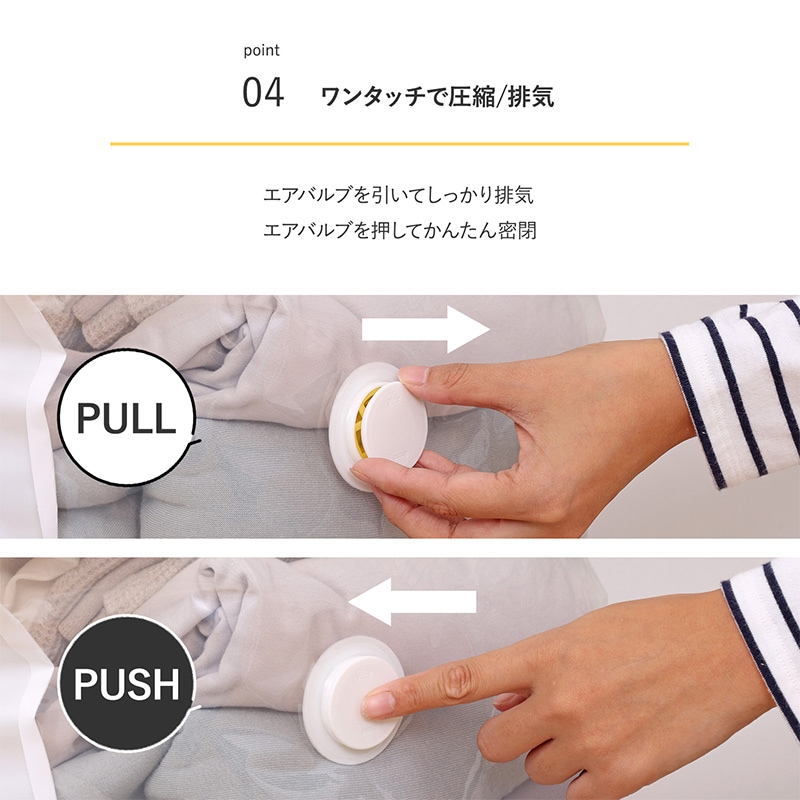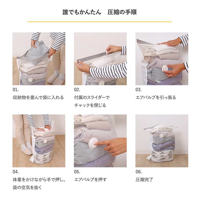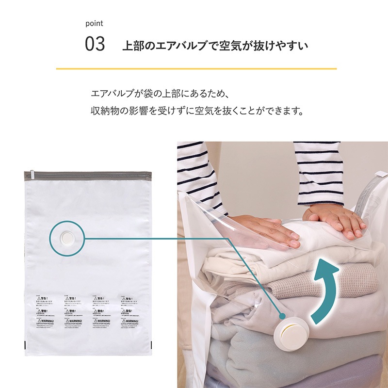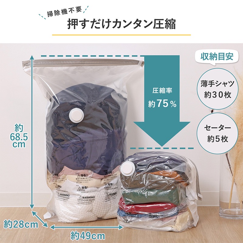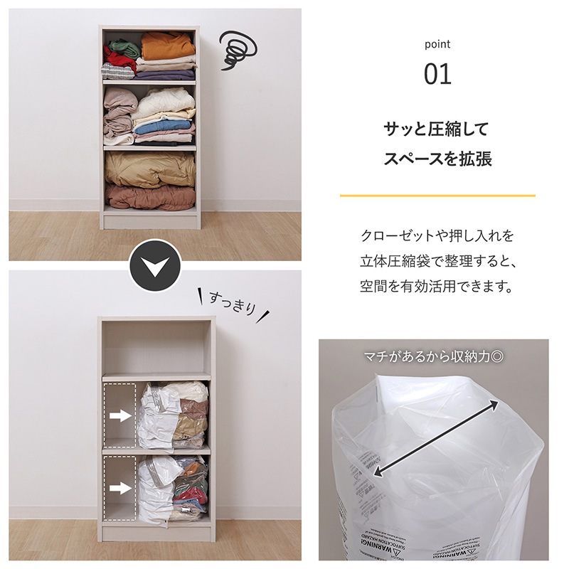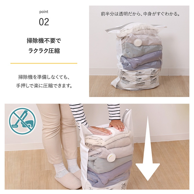 ●マチ付きでたっぷり収納できる手押しタイプの圧縮袋。オフシーズンの衣類などをまとめてスッキリ収納。