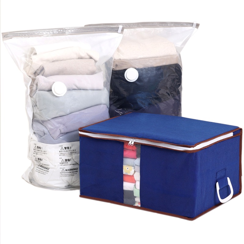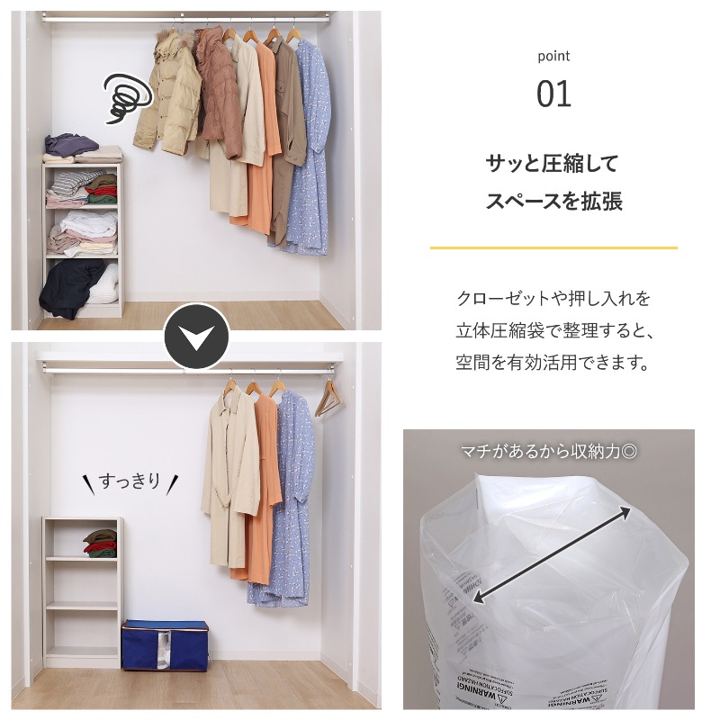 ●衣類やタオルを圧縮してコンパクトに保管できる立体タイプの圧縮袋と収納ボックスのセット。