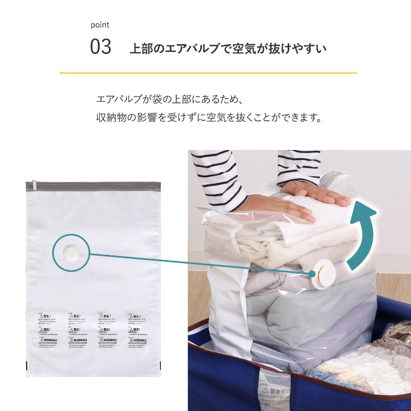 収納目安(圧縮袋1枚あたり):薄手シャツなら約30枚、セーターなら約10~15枚、タオルケットなら約3~4枚